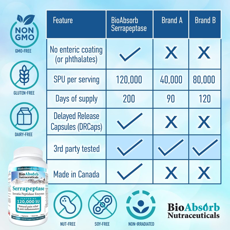 Why BioAbsorb Serrapeptase?Our capsules use the patented Delayed Relayed (DRCaps) technology clinically proven to resist stomach acid. This allows Serrapeptase to survive stomach acid intact. It is then taken up into the blood stream where it can travel to various parts of the body.Product Features:120,000 SPU Delayed Release (DRCaps) capsules for better absorption Vegetarian Non GMO Non irradiated Gluten Free Dairy FreeOrder Now, Risk Free Thanks to Our Money-Back Guarantee.