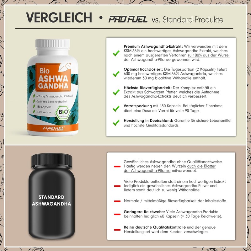 - ⚡ ASHWAGANDHA OPTIMAL HIGH DOSED: The ashwagandha root extract has been optimally high dose according to scientific findings. The daily serving consists of 2 capsules and contains 600 mg of high-quality KSM-66 ashwagandha root extract. Thanks to the high withanolide content of 5%, the organic Ashwagandha capsules provide the body with 30 mg of valuable withanolides per day. One can contains 180 capsules and is therefore enough for a full 90 days.