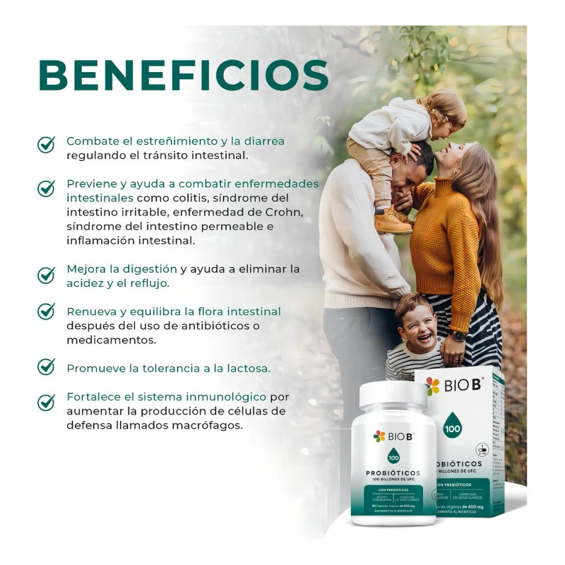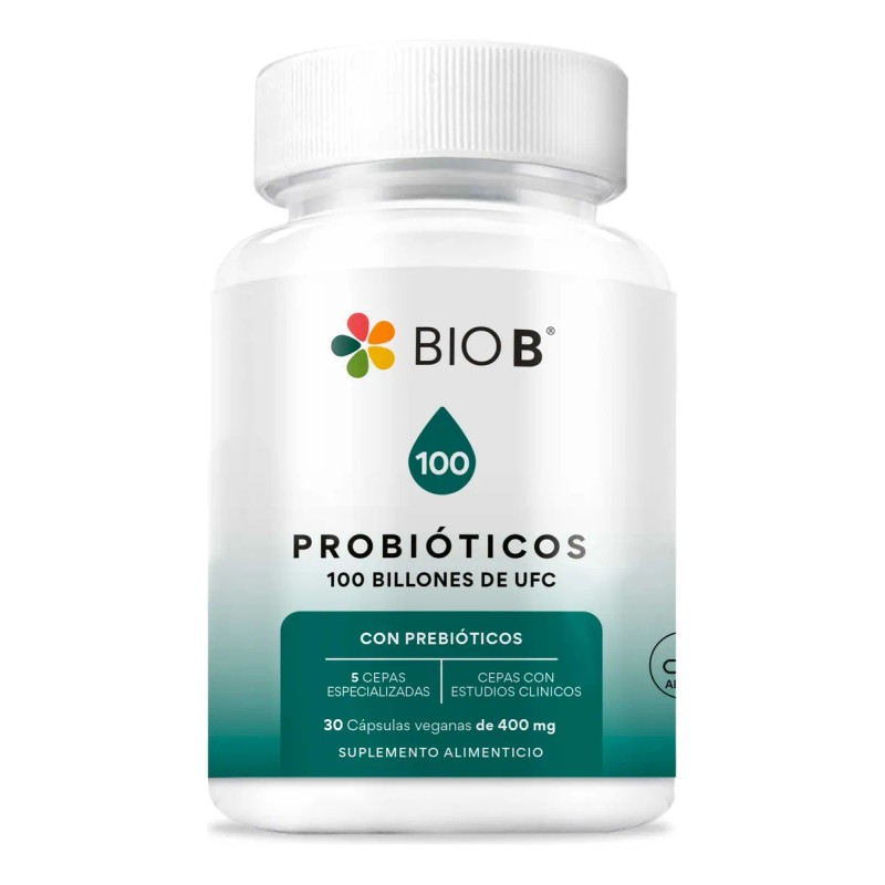 Bio B Probióticos es un suplemento de alta potencia que combina 100 billones de UFC (Unidades Formadoras de Colonias) por porción con una mezcla selecta de prebióticos, para lograr una microbiota intestinal equilibrada, fortalecer el sistema inmunológico y mejorar la salud digestiva desde la raíz. 🌿