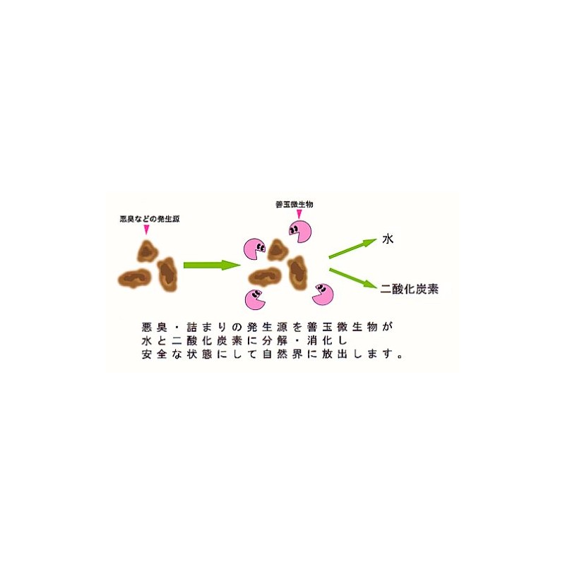 - Formulated microorganisms / enzymes: Microorganisms / Protein digestive bacteria, Starch digestive bacteria, Cellulose digestive bacteria, animal and vegetable oil digestion bacteria, surfactant digestive bacteria, hydrocarbon digestive bacteria, phenolic digestive bacteria, enzymes / lipase, protein amyase, cellulase
