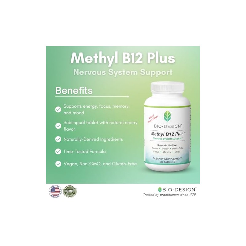 Bio-Design Methyl B12 Plus Nervous System Support Supplement - Full Spectrum Natural Bioactive Methylated B Vitamins - Supports Healthy Nerves, Blood Cells, Memory, & Mood- 60 Sublingual Tablets
