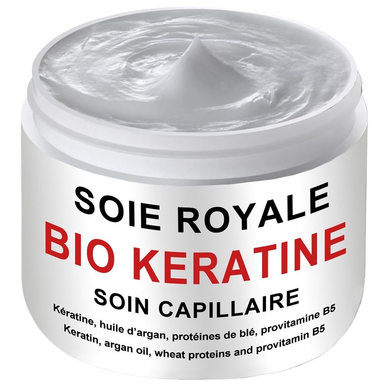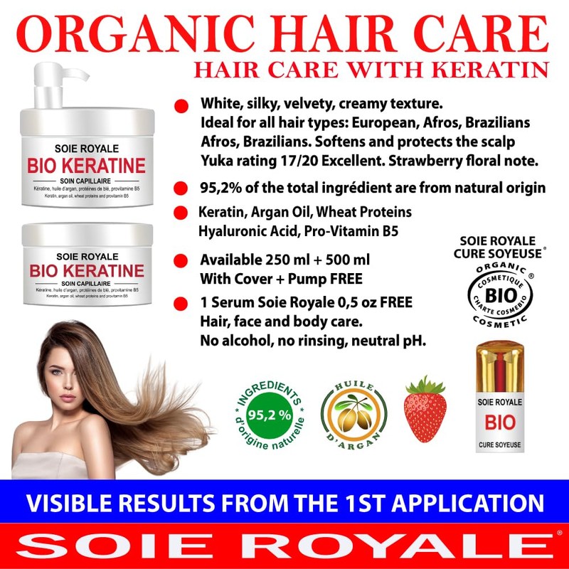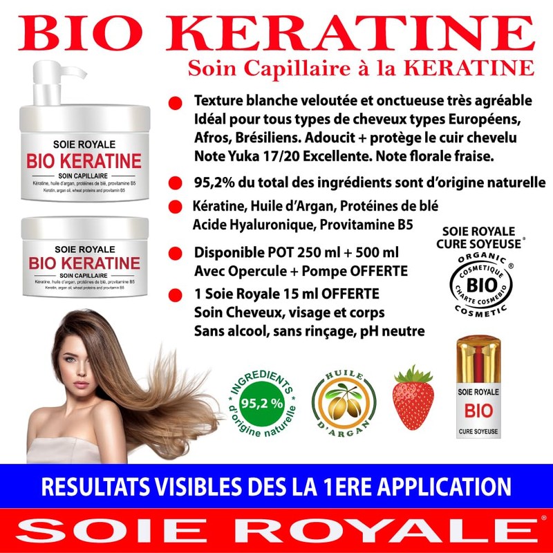 Bio-Haarpflege, Keratin, 250 ml, natürliche Bio-Maske, repariert, spendet Feuchtigkeit, nährt, entwirrt, glättet, für alle Haartypen, inklusive 1 Serum aus Königseide, Bio-Kur, 15 ml