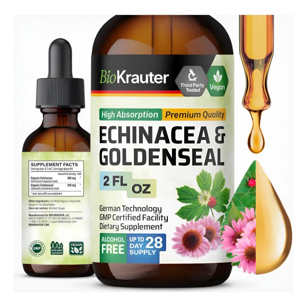- Extracto de Equinácea y Raíz de Goldenseal para Inmunidad: Extracto BioKrauter de Echinacea purpurea y Hydrastis canadensis para apoyar la inmunidad y la salud respiratoria.