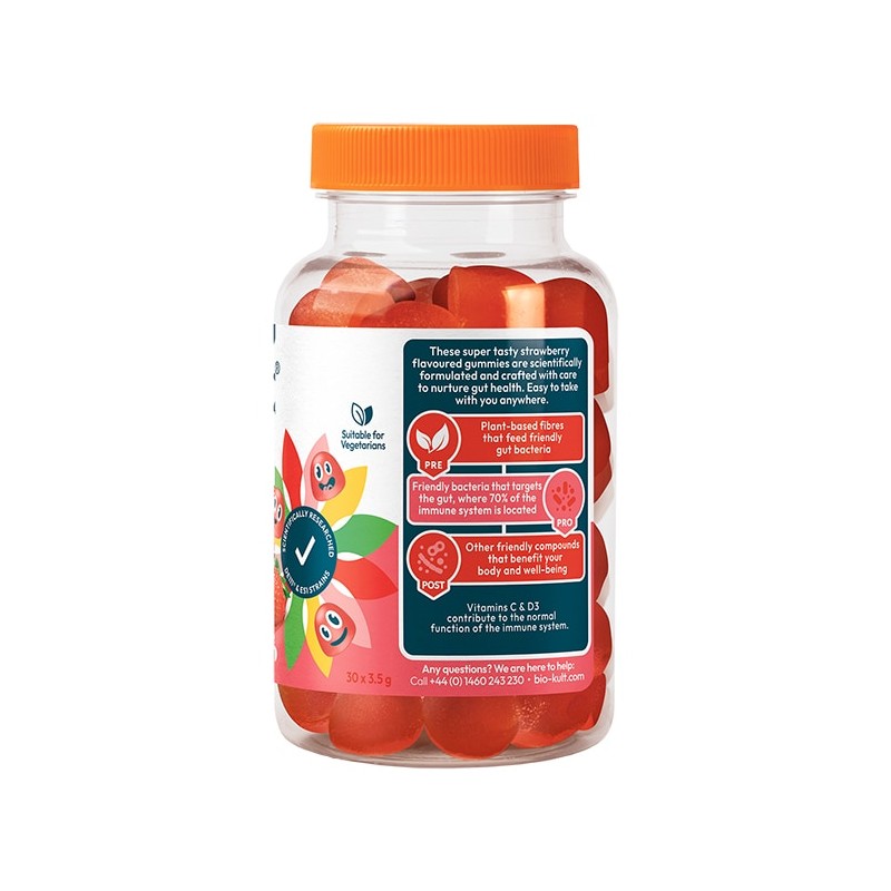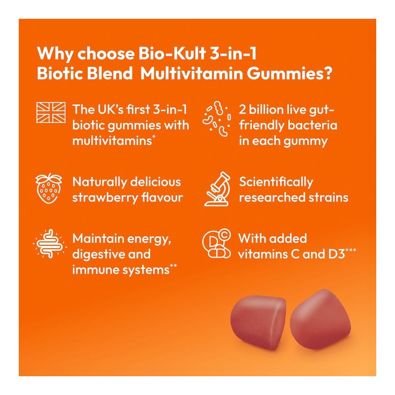 - Unique pre + pro + post formula: The UK’s first 3-in-1 biotic gummies with multivitamins* and scientifically researched strains