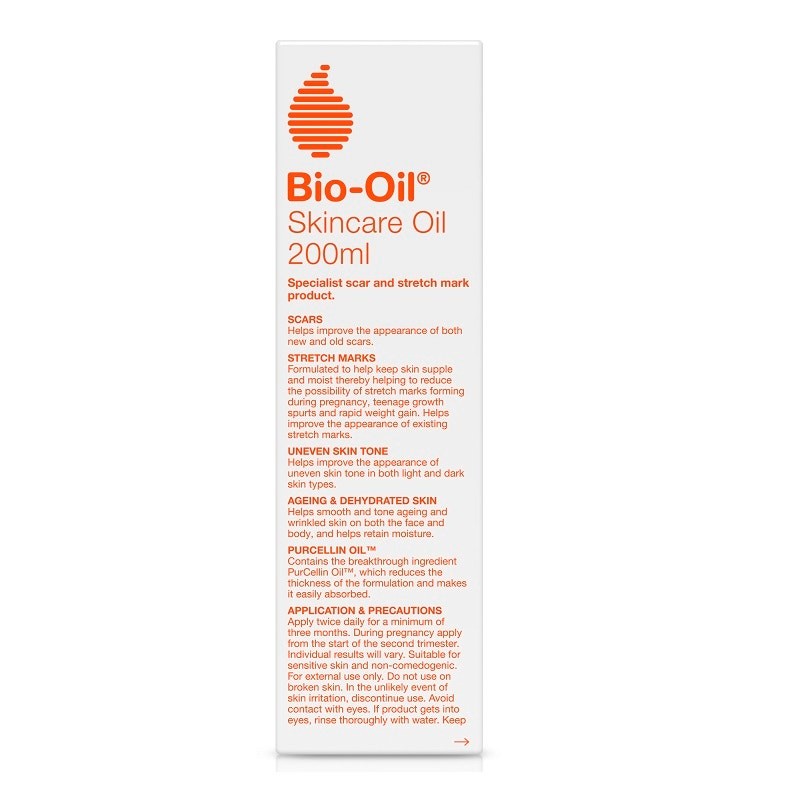 Bio-Oil is a skincare oil developed to help improve the appearance of scars and stretch marks. Its advanced formulation also makes it extremely effective for numerous other skin concerns. It helps promote even skin tone, nourishes ageing skin and provides intensive lubrication to dry, flaky skin. Bio-Oil is a rapidly absorbed 'dry' oil and leaves no oily residue.