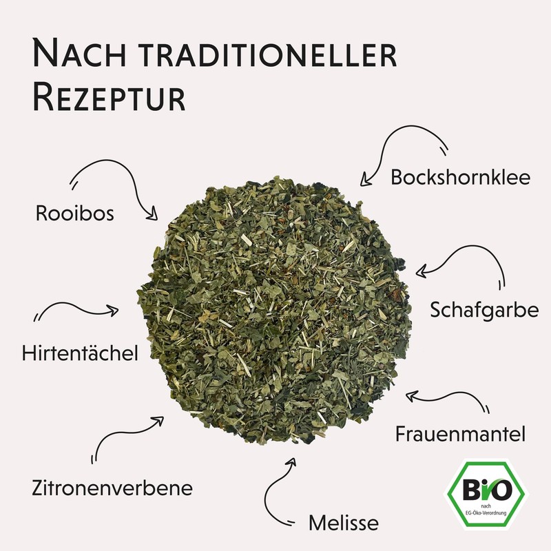 - TRADITIONELLE REZEPTUR: Frauenmantel, Hirtentäschel, Schafgarbe, Rooibos, Bockshornklee, Melisse, Zitronenverbene - 80 g loser Bio Kräutertee ohne Aromastoffe und ohne weitere Zusätze.