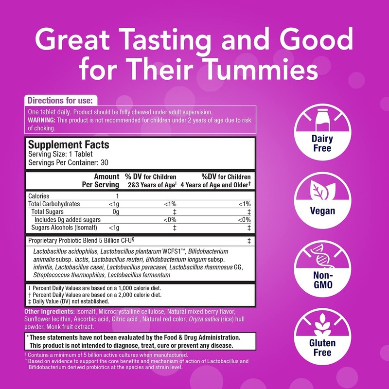 - GREAT-TASTING PROBIOTICS FOR KIDS: Our chewable kids probiotics are the best daily probiotics to support digestive balance for growing bodies. Unlike the leading kids gummy probiotics, contains no sugar, syrup or corn startch