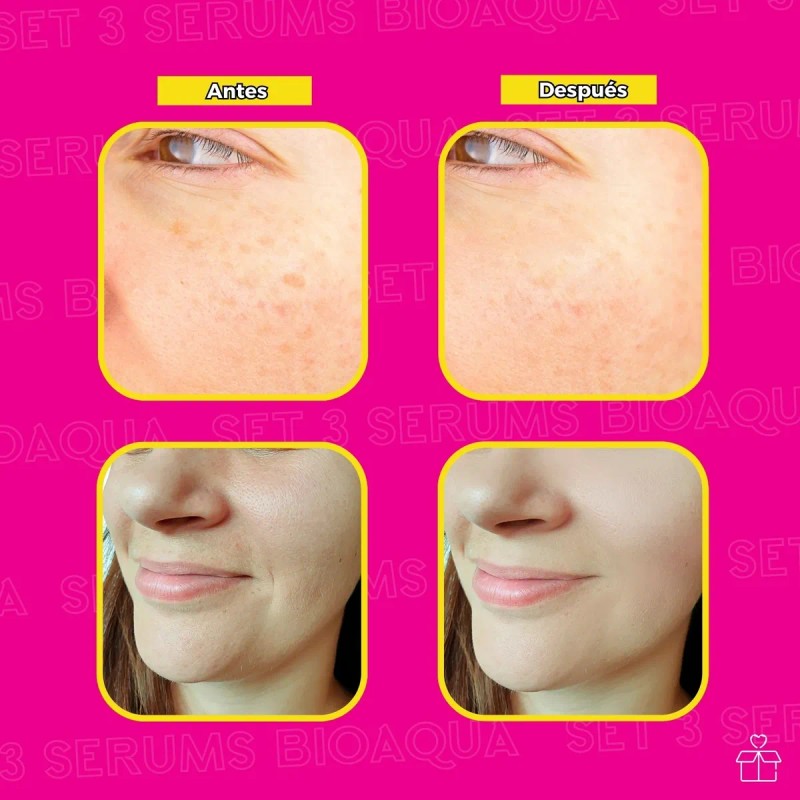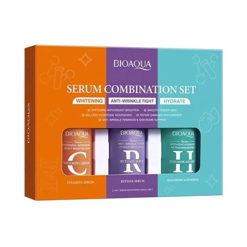 Set de 3 serums marca Bioaqua. El set incluye un serum de vitamina C, un serum de retinol y un serum de ácido hialurónico.