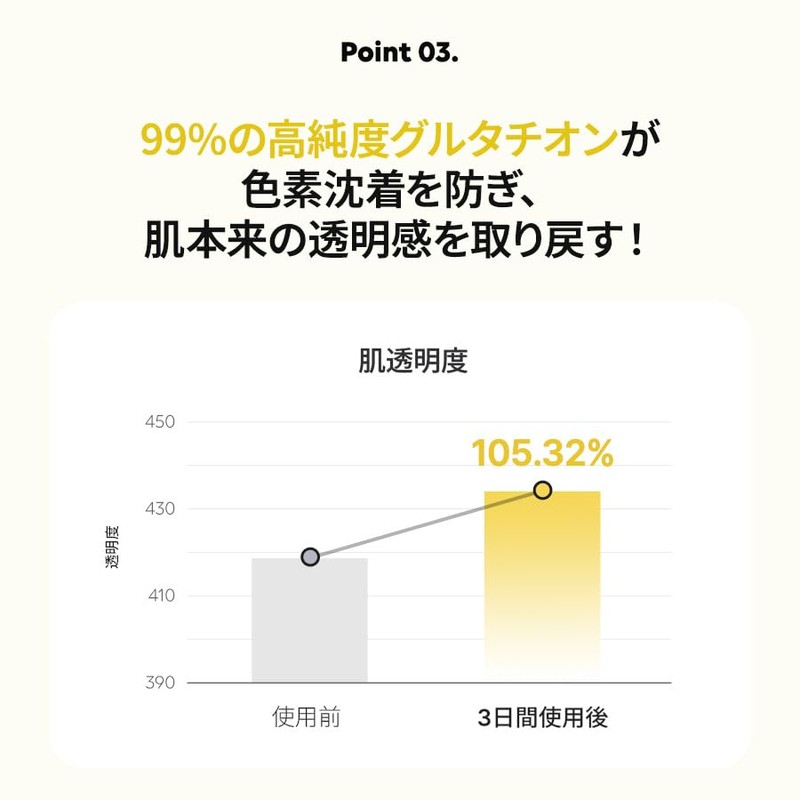 - 【99%高純度グルタチオン】 99% 高純度グルタチオンが肌本来の透明感を取り戻し、ツヤ肌へと導きます。