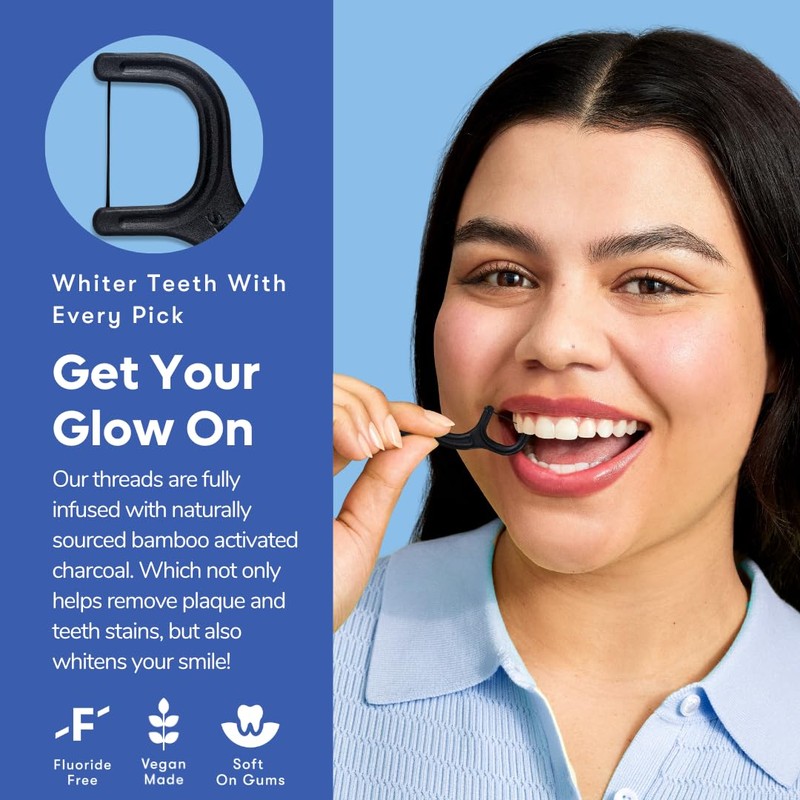 - A WHITER SMILE: 100% Pure activated charcoal infused flosser made with the purpose of whitening your teeth with every floss pick. Each thread is reinforced and tested to ensure you can floss in peace.