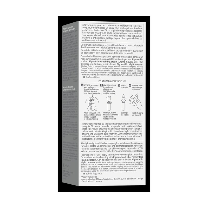 Apply 5 fingers every night for 1 month on face, neck and décolleté, after cleaning with Pigmentbio Foaming Cream.