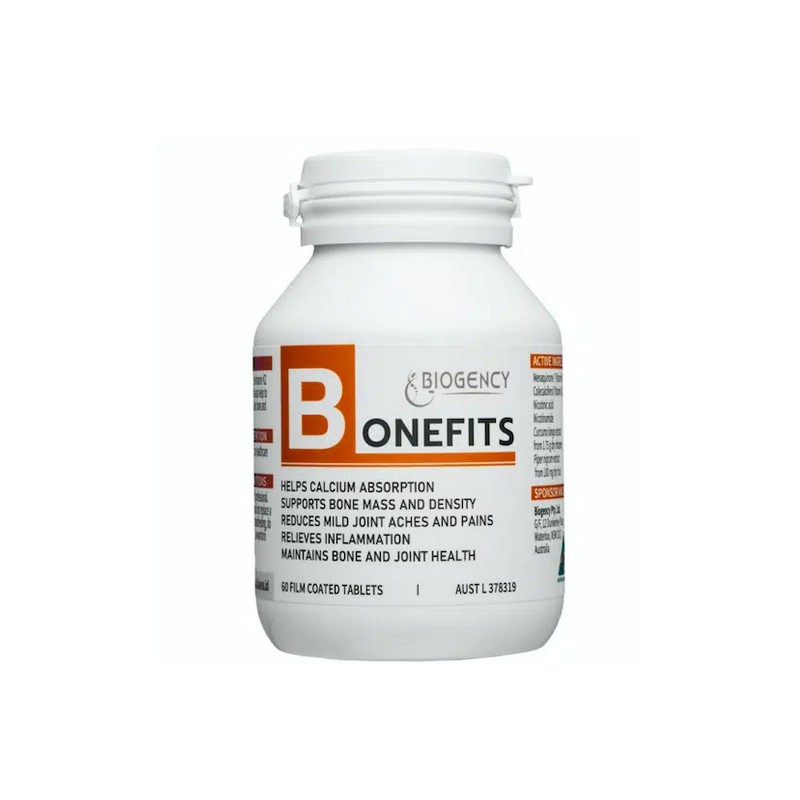 Biogency® Bonefits Tablets provide vitamin D3 that helps calcium absorption and vitamin K2 MK-7 that helps enhance bone mass and density. The antioxidants in the formula also help to relieve inflammation and mild pains in joints. Biogency Bonefits tablets maintain bone and joint health as well as general health and wellbeing.