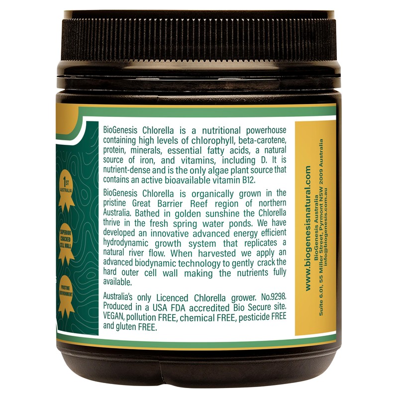 - BioGenesis Chlorella is organically grown in the pristine Great Barrier Reef region of northern Australia. Bathed in golden sunshine the Chlorella thrive in the fresh spring water ponds.