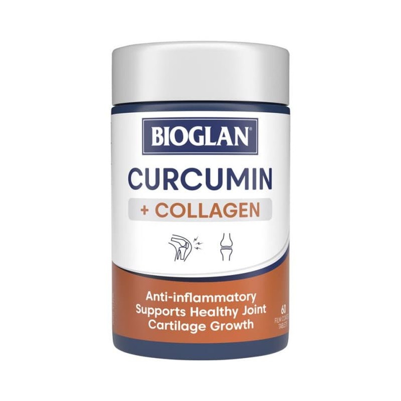 - BIOGLAN Curcumin + Collagen combines the natural anti-inflammatory power of Curcumin with collagen peptides to support healthy joint cartilage growth to maintain flexibility, mobility and joint health. Boosted with Vitamin C to support collagen formation and BioPerine™ to increase absorption of Curcumin in the body. Contains antioxidants to reduce free radicals formed in the body.