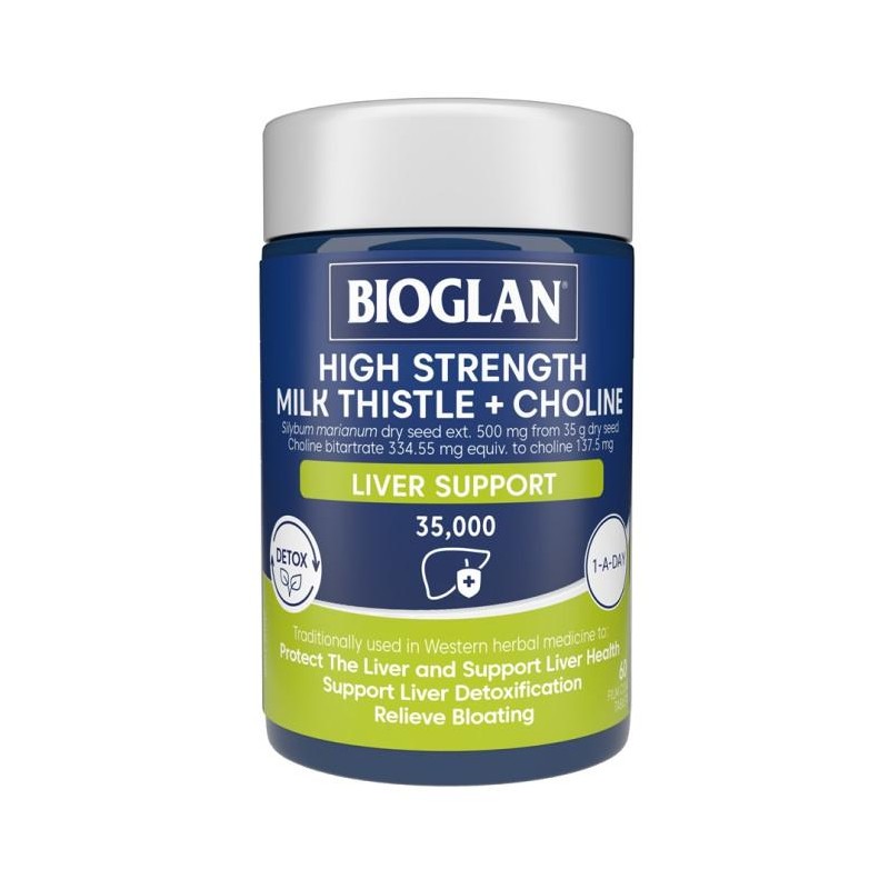 Bioglan High Strength Milk Thistle + Choline combines the natural detoxifying benefits of Milk Thistle with the essential nutrient Choline, delivering powerful liver support in a convenient one-a-day formula. Traditionally used in Western herbal medicine, Milk Thistle helps maintain healthy liver function, supports the body’s natural detoxification processes, and assists in relieving abdominal bloating.