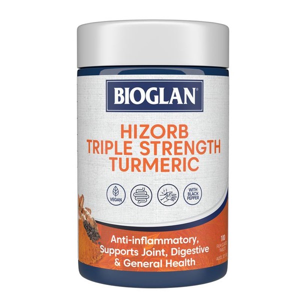 Bioglan's Hi-Zorb Triple Strength Turmeric combines the anti-flammatory benefits of turmeric with black pepper extract to enhance absorption within the body.