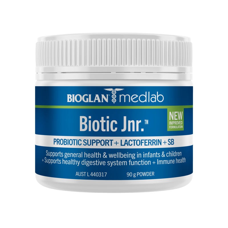 Bioglan Medlab Biotic Jnr™ contains a combination of probiotics, lactoferrin, and Saccharomyces Boulardiiwhich is backed by scientific evidence to support healthy digestive function, immune and skin health in infants and children. Biotic Jnr™ works to support the developing infant and child immune systems, strengthening innate immune function, while supporting digestion and the gut bacteria diversity. The formulation also helps reduce the occurrence of symptoms of eczema and dermatitis in infants and children.