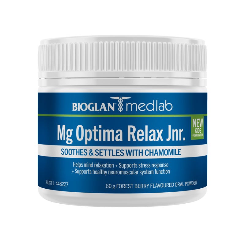 Mg Optima Relax Jnr., contains magnesium and B6 for mind relaxation together with Chamomile which is traditionally used in Western Herbal Medicine for soothing the nerves, inducing sleep, supporting healthy sleeping patterns, and settling upset tummies.