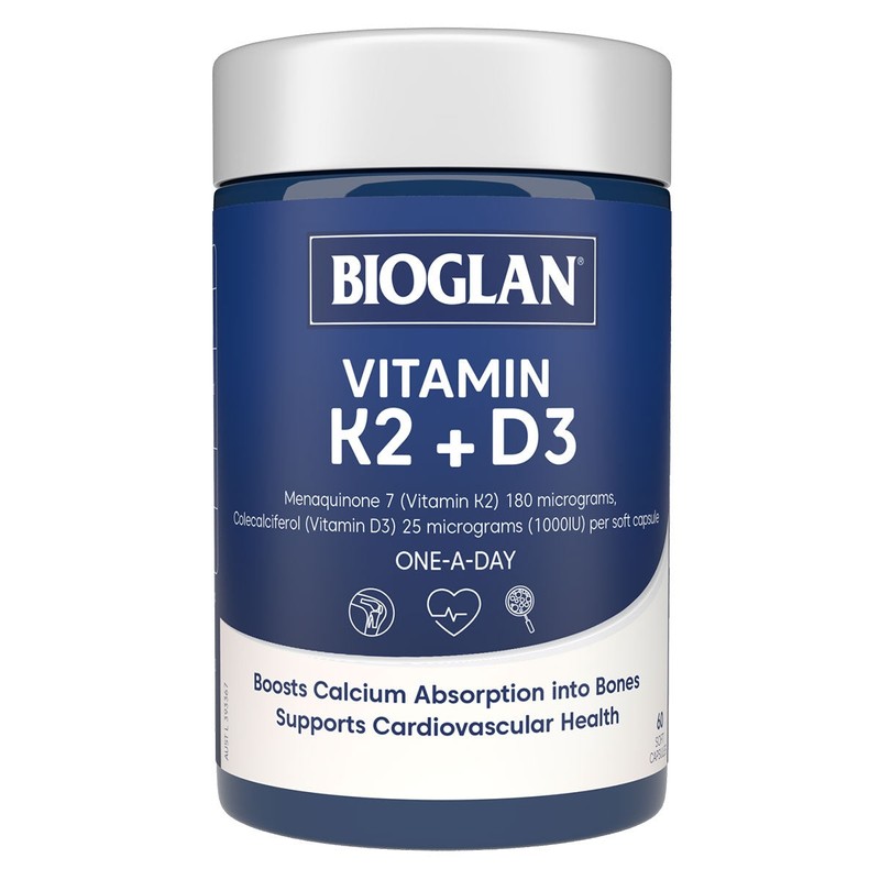 Bioglan Vitamin K2 + D3 help keep your bones strong & healthy. Vitamin K2 supports healthy blood vessels & circulation. Vitamin D3 helps with calcium absorption into the bones to help protect against osteoporosis.