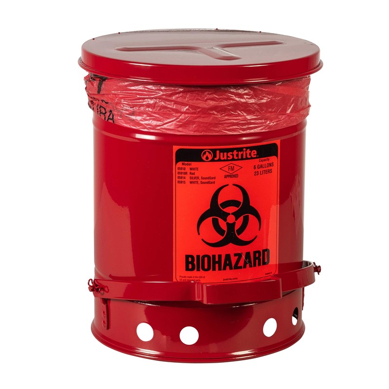 Justrite biohazard waste containers meet OSHA 29 CFR 1910.1030 for the segregation of infectious waste. They may be used to store contaminated laundry as well as other regulated waste. Sturdy steel cans feature leakproof construction with foot-operated, self-closing lid. Simple, foot pedal operation opens the container cover automatically to safely dispose of biohazard waste. Upon release of pedal, the can cover closes quickly to reduce the risk of contamination. A biohazard bag is held securely around the circumference of the can top. 6 gallons capacity. Measures 11-7/8-inches outer diameter by 15-7/8-inches height.