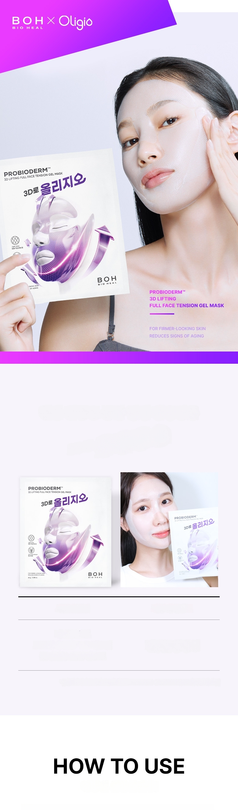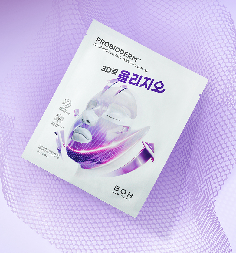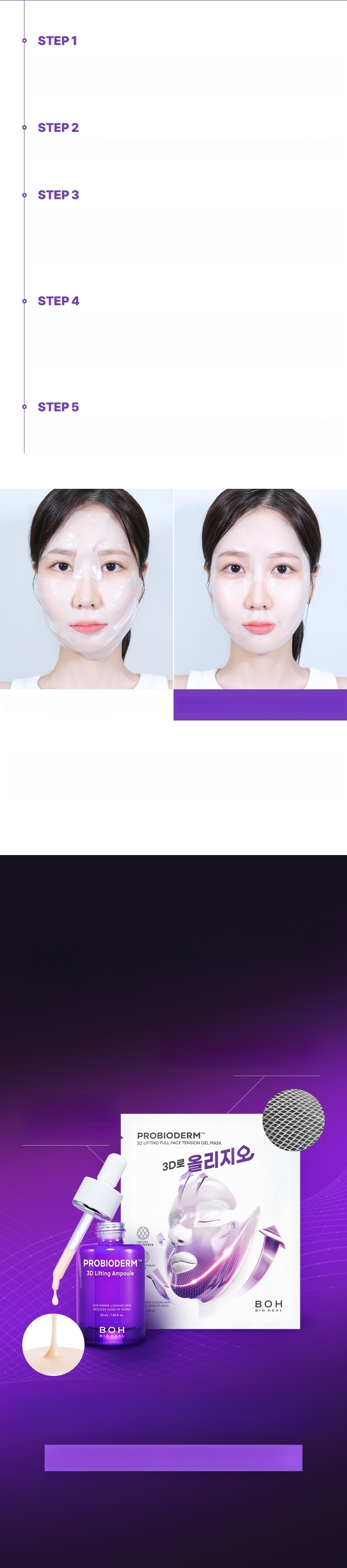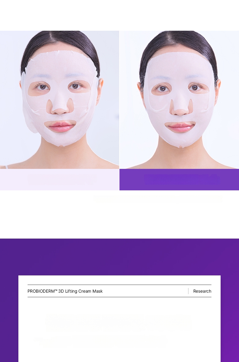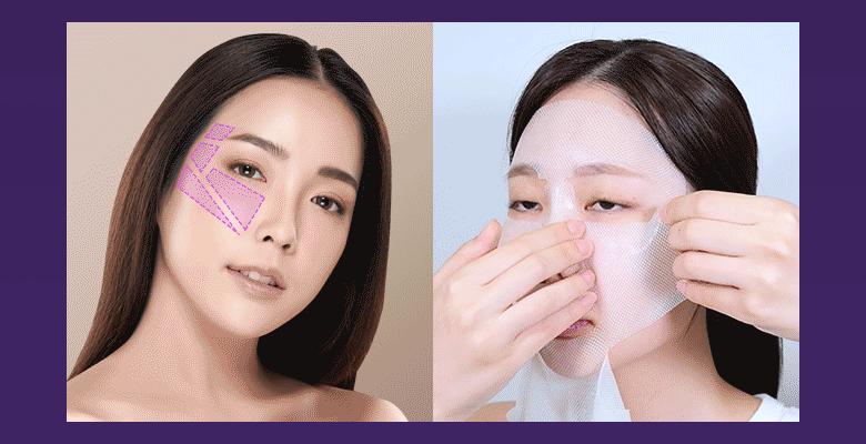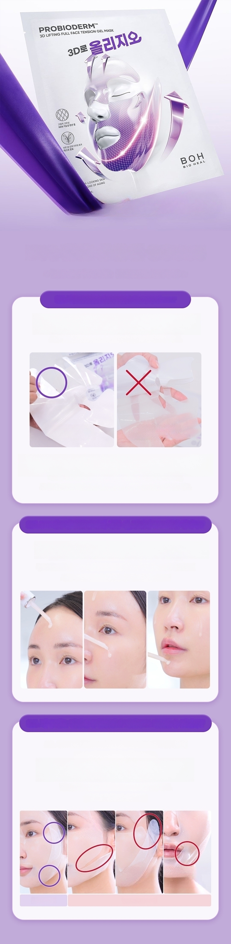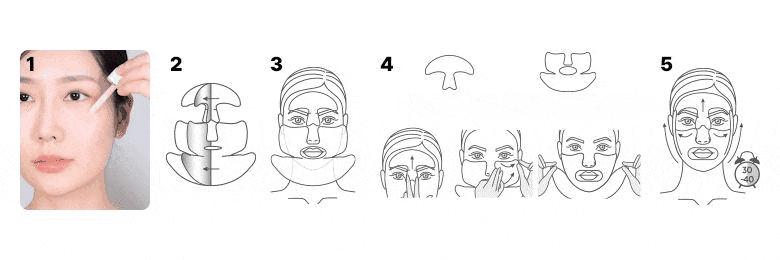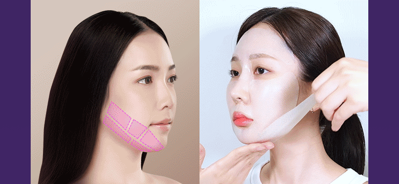 1. After cleansing, smooth skin texture with a toner pad. 2. Stretch the sheet from mid-face to the side cheekbone line and apply. 3. Stretch and apply the lower sheet from the jawline to the temple, lifting upwards. 4. After about 10-20 minutes, remove the mask and finish with a 3D lifting cream.