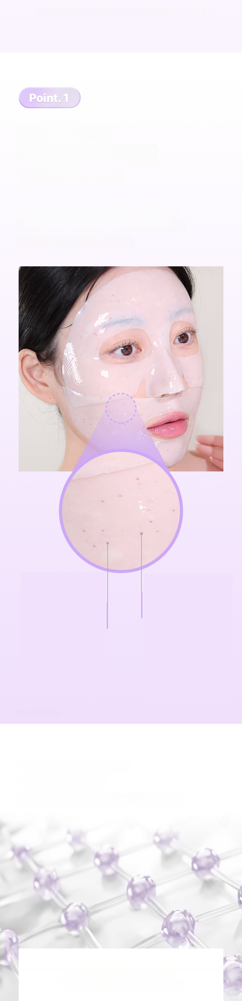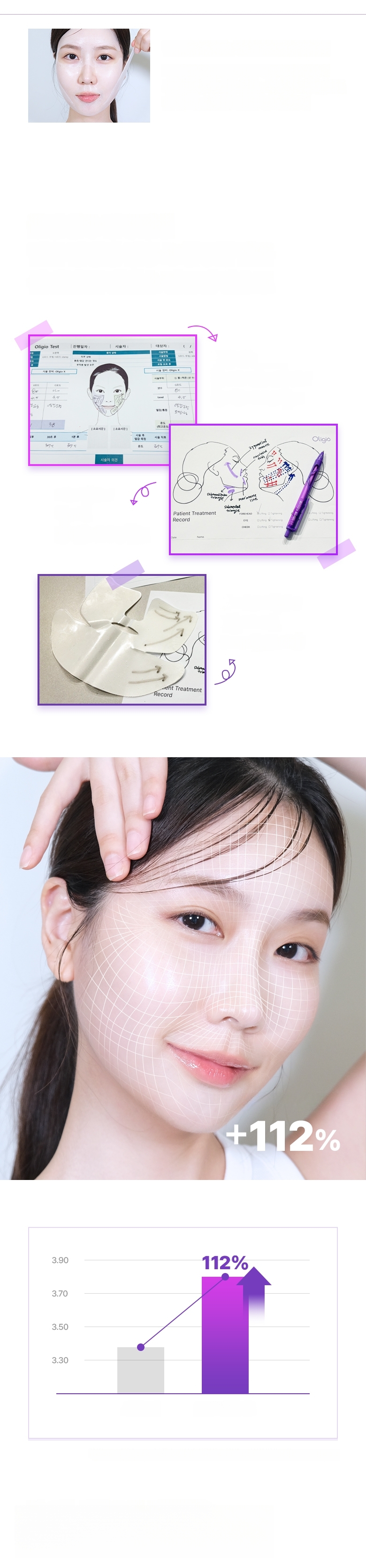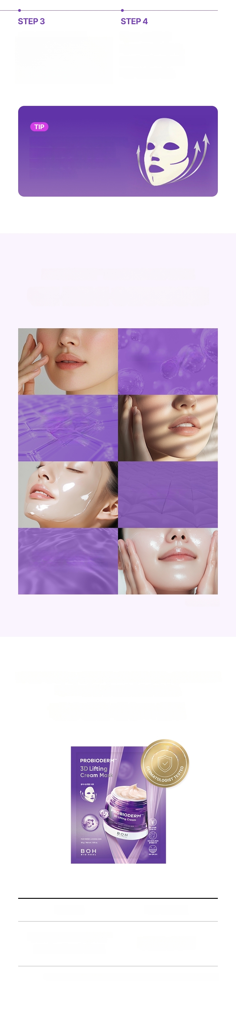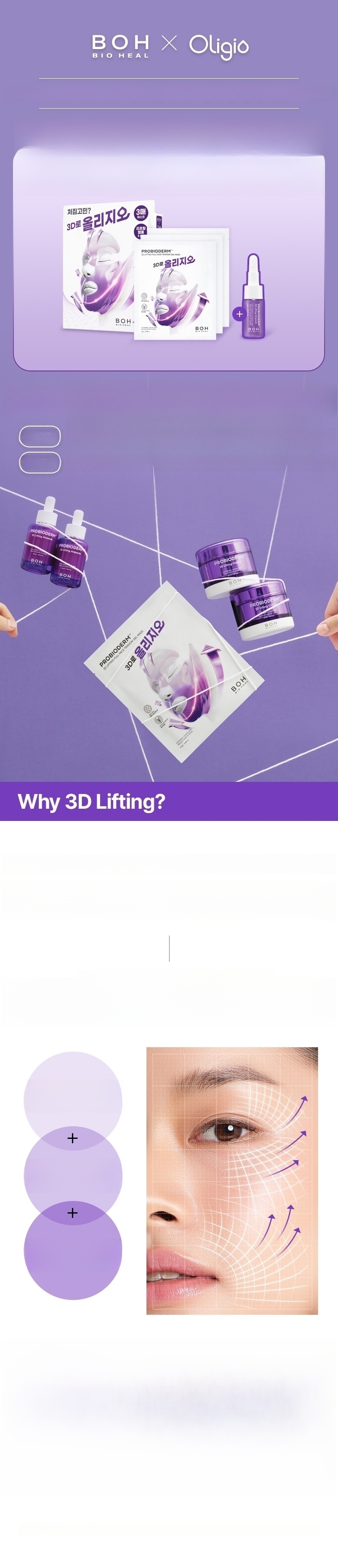 1. After cleansing, smooth skin texture with a toner pad. 2. Stretch the sheet from mid-face to the side cheekbone line and apply. 3. Stretch and apply the lower sheet from the jawline to the temple, lifting upwards. 4. After about 10-20 minutes, remove the mask and finish with a 3D lifting cream.