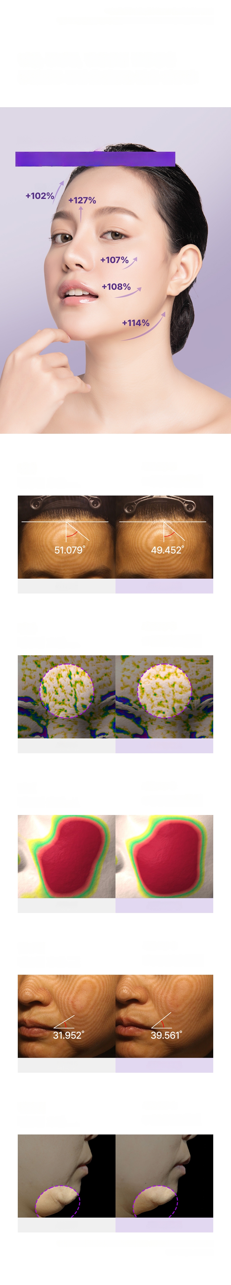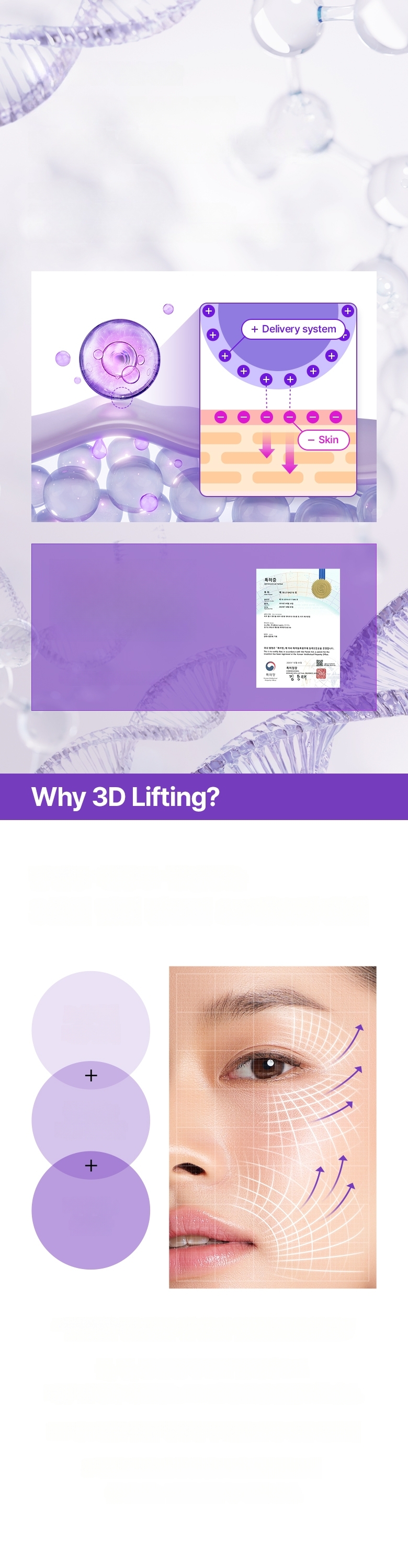 Offers 3D lifting solutions for the youthful triangular zones of the face, providing dimensional care tailored to sagging mid and lower face signals. Completed skin elasticity improvement tests. Flexible fabric with good tension fits tightly on mid and lower face, making it effective for daily lifting. Uses Cationic Liposome Technology with excellent ingredient penetration that feels like a skin magnet, giving a skin-pulling sensation.