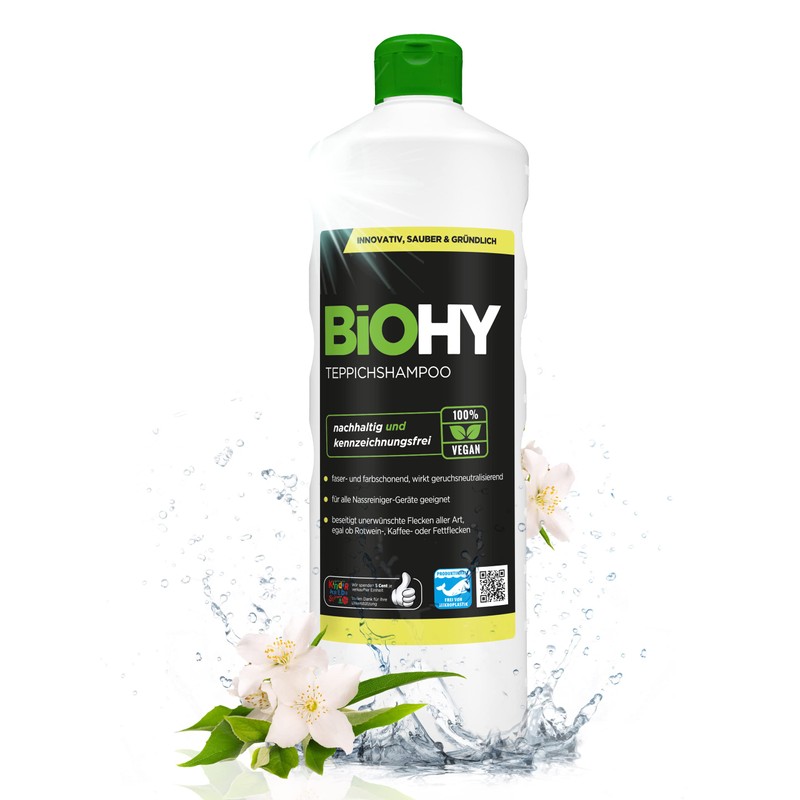 - Features: Our Biohy carpet shampoo removes street or pet dirt and is particularly effective against red wine, grease, coffee, ketchup and shoe cream stains. The special ingredients eliminate odours, leave a fresh fragrance and fresh old colours. Our carpet shampoo is also suitable for wet cleaning equipment.