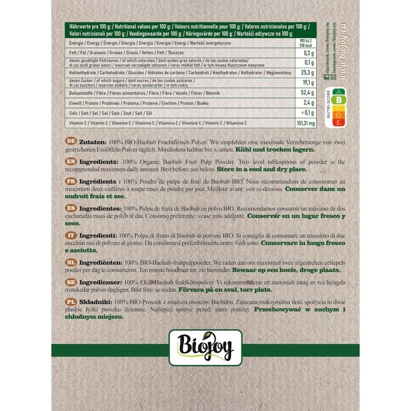 Biojoy Organic Baobab Powder (250 g), Baobab Pulp Gently Ground, No Additives, Baobab Powder (Adansonia Digitata)
