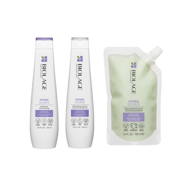 The Biolage Hydrasource Trio Bundle includes Biolage Hydrasource Shampoo, Biolage Hydrasource Detangling Solution, and Biolage Hydrasource Deep Treatment Pack for healthy-looking, moisturized, and shiny hair.