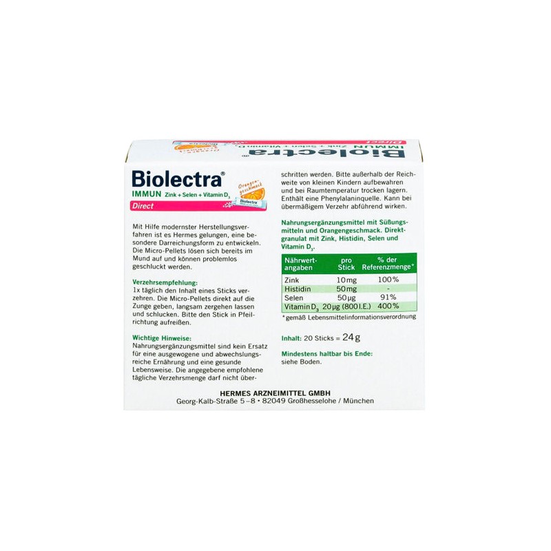 Biolectra Immune Direct is dietary supplement with zinc, selenium and vitamin D3. It contributes to the normal functioning of the immune system.