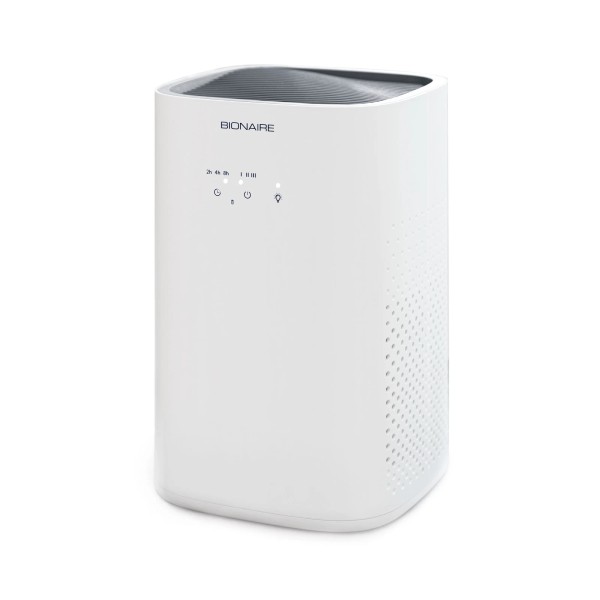 Breathe cleaner, fresher air with Bionaire. The Bionaire Medium Room True HEPA Air Purifier purifies the air using a 360-degree air intake system to efficiently capture air from all around a room. The 360-degree filter works to clean your air in 3 stages. The first stage captures large particles like hair and dust in the pre-filter. In the second stage, small particles as small as 0.3 microns pass through the True HEPA filter, which removes up to 99.97% of airborne allergens from the air including smoke, mold spores, pet dander, pollen, dust mites, and bacteria. Finally, in the third stage, the carbon layer eliminates common household odors such as cooking fumes and pet odors. This True HEPA air purifier can clean the air in spaces of about 155 square feet, making it ideal for most bedrooms. Features a low/quiet setting that allows it to continue cleaning the air throughout the night without disturbing your sleep.3-STAGE FILTRATION: The 3-Stage Filtration System removes up to 99.97% of airborne pollutants and allergens, capturing particles as small as 0.3 microns; air filter is designed to include a pre-filter layer, True HEPA filter, and a carbon filter 360-DEGREE AIR INTAKE: 360-degree air intake system efficiently captures air from all around the room to purify and release crisp clean air PERFECT FOR BEDROOMS: 100 CADR (Clean Air Delivery Rate) allows pure airflow, with coverage ideal for most bedrooms and other medium-sized rooms up to 155 square feet QUIET OPERATION: At the low setting, operates at 30 decibels/dBA (as quiet as a library) so you can enjoy a restful night of sleep, while still benefitting from clean air 3 SPEED SETTINGS: 3 speed settings to customize your comfort NIGHT-LIGHT: The soft night-light creates a perfect environment for a good night's sleep, making it ideal for use in any bedroom CERTIFICATIONS: Tested to AHAM standards; FCC certified; ETL listed