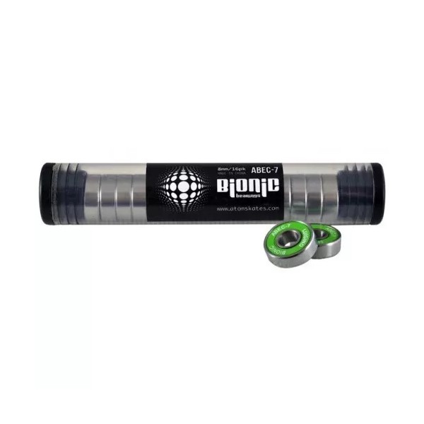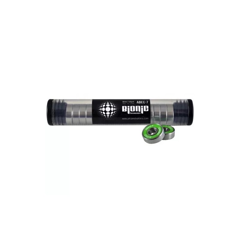 Bionic Bearings use rings, shields, removable Delrin cage 20% glass reinforced, ABEC grade, radial play and lubricants that have been specified by skaters, for skaters. Bionic Bearings are deep-grooved for handling maximum radial and thrust loads in either direction.  All Bionic Bearings are made with non-contact shields for maximum rolling and are designed for low maintenance and high-performance.  Spend more time enjoying your sport and less time worrying about your equipment.