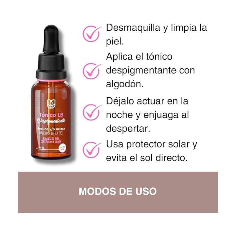 FORMULAOur exclusive formula:It helps the skin look more even and radiant.Gently exfoliates, helping to remove dead cells from the surface layer of your skin.It helps keep the skin less shiny and less greasy.Made with ingredients internationally approved for cosmetic use, providing safety and confidence in each application.INFORMATIONFor 10 years, LB Tonico has established itself as a benchmark in skincare. Its advanced formula, with ingredients approved by international standards, is designed to help improve the appearance of imperfections, achieving a more even and youthful appearance.Furthermore, the trust and quality of Tratamientos LB SAS have encouraged women and men across the country to become wholesalers, bringing this product to thousands of homes and turning it into a reliable and secure source of income.HOW TO USECleanse and/or remove makeup completely from your skin; make sure it's free of all other products.Moisten a cotton ball with at least 3 drops initially and increase the amount weekly, without exceeding 15 drops.Apply the product evenly to your face; remember not to apply it to sensitive areas . Apply by dabbing, avoiding rubbing or touching up.Let the product sit and apply it every other day. Remember that it's only for nighttime use and that you shouldn't expose yourself to the sun while wearing it.The next morning, wash your face thoroughly with plenty of water and pH-neutral soap.It is mandatory to use moisturizer and sunscreen to ensure effective and long-lasting results.NOTE: After 16 weeks of using the product, you should discontinue use for 30 days. Moisturize and protect your skin from the sun so it rests and looks its best. After this time, continue with your normal routine. (For facial use only and apply only at night.)
