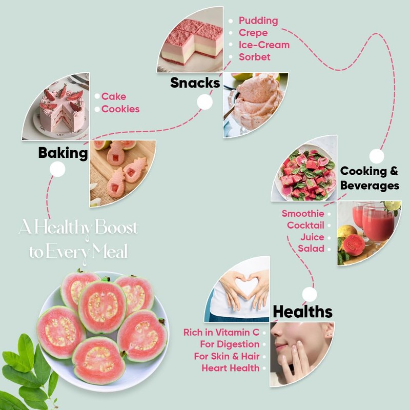 - Rich in Vitamin C: Pink Guava Pulp Extract is one of the richest natural sources of vitamin C, promoting immune health, skin vitality, and collagen production.