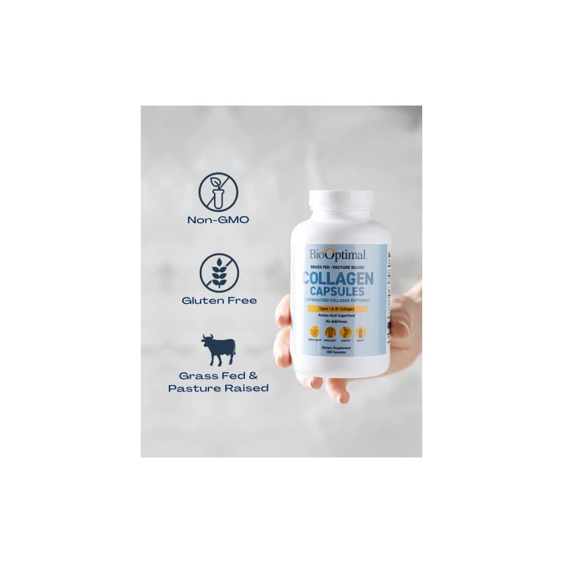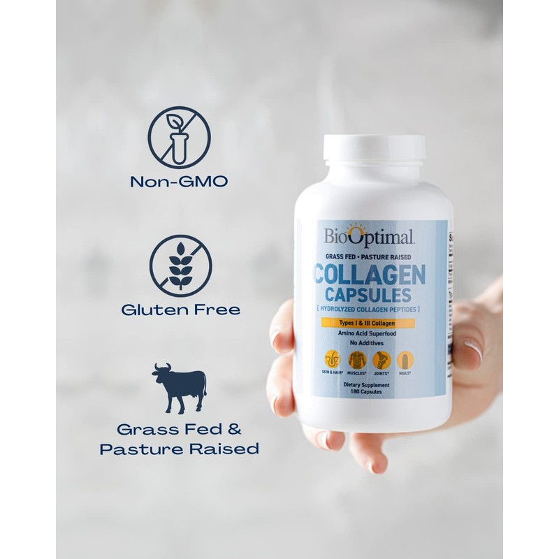 BioOptimal Collagen Pills - Collagen Supplements, 180 Capsules, for Skin, Hair, Nails & Joints, for Women & Men, Grass Fed, Non-GMO, Pasture Raised, Premium Quality, Packaging May Vary