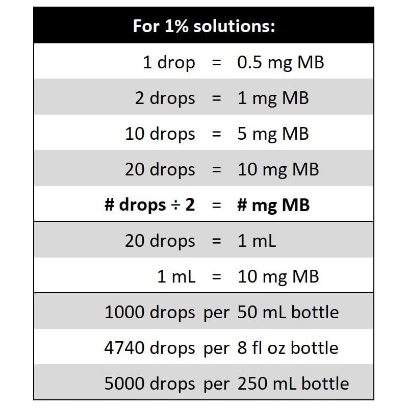 - Genuine Biopharm methylene blue items conveniently come with volume markings etched on the glass dropper heat sealed inside the glass bottle.
