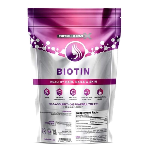BioPharmX Biotin - 365 Tablets, 1 Year Supply 10,000mg Maximum Strength Tablets for Hair Growth, Nail Strength, and Skin Health - Healthcare