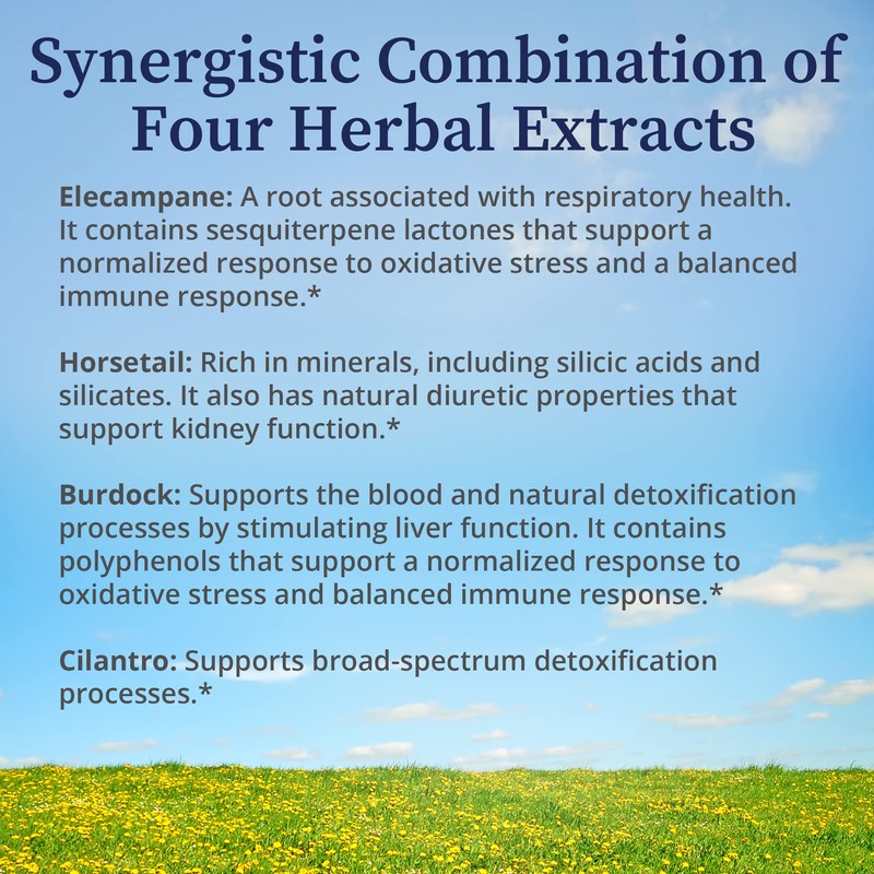 - SYNERGISTIC COMBINATION OF 4 HERBAL EXTRACTS: Elecampane, Cilantro, & Horsetail supports detox, neurological and lung function, and the addition of Burdock root nourishes the liver and optimizes toxicant elimination via the kidneys & bowels.*