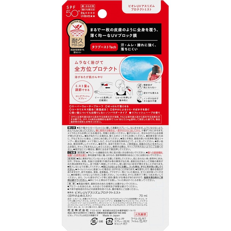 Reapply to your body! An all-round mist that covers your skin evenly. You can adjust the amount of mist (press and hold to cover a wide area). Feel refreshed every time you apply it. UV protection that can withstand harsh environments of 40°C and 75% humidity. *Best class UV protection in the Biore UV series (SPF50+PA++++) and resistance to removal of coating film in high temperature and humidity environments. Uses Tough Boost TECH, which is resistant to sweat, stuffiness, and rubbing and does not easily come off. Can be removed with soap. Refreshing herb scent.