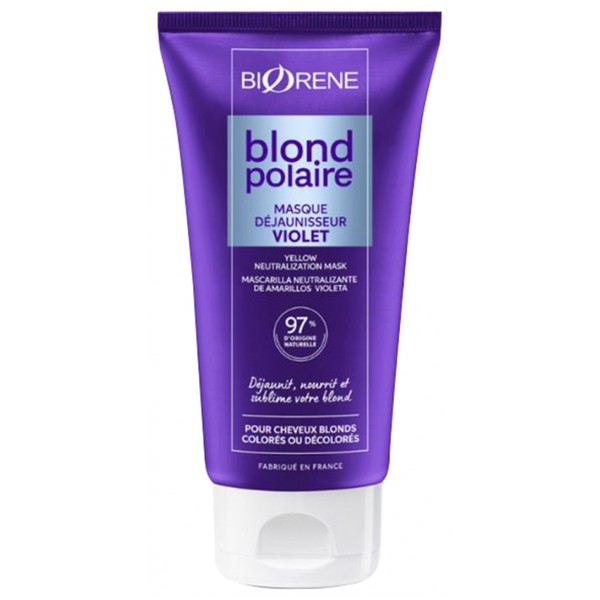 Biorène Polar Blond Yellow Neutralization Purple Mask 150 ml is a mask for natural, highlighted or bleached blond hair, for a longer-lasting, radiant polar blond. It contains colorants that neutralize unwanted yellow and orange highlights, bringing cool reflections to polar blond hair from the very first use.