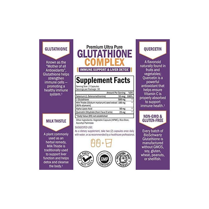 - Natural liver detox: BioSchwartz glutathione complex is specially formulated with quercetin and milk thistle to support and encourage liver function and help remove toxins that can impact overall and immune health.