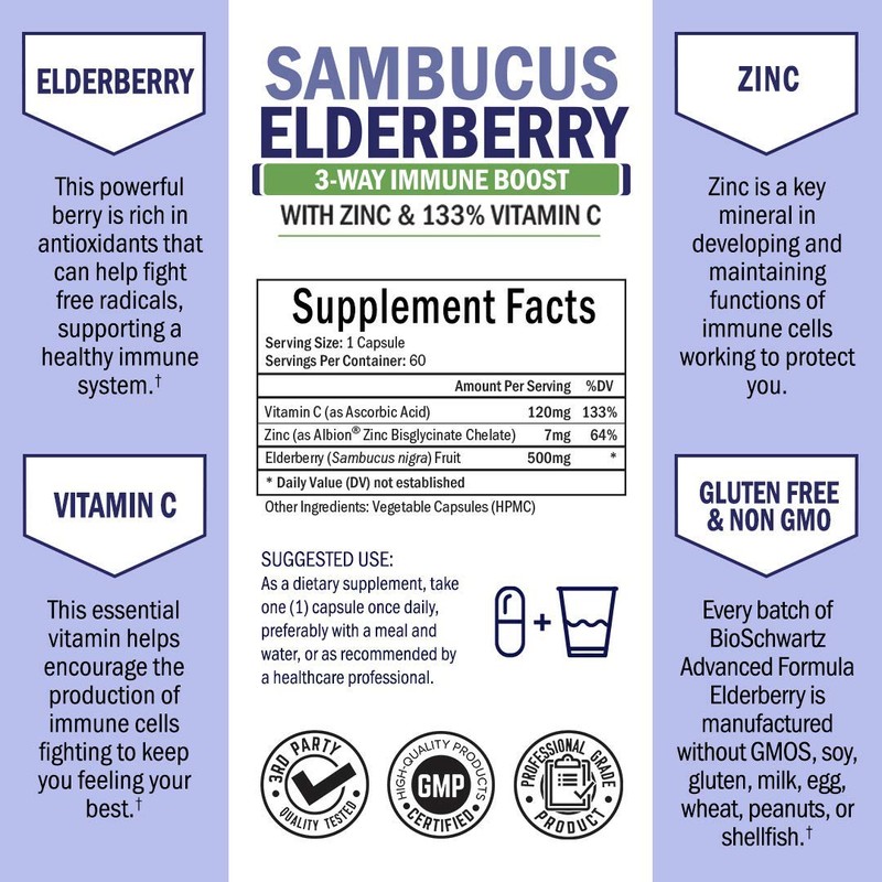 - 3-way immune support formula: BioSchwartz sambucus elderberry (sambucus nigra) formula also contains zinc and 133% vitamin C, 2 crucial vitamins and minerals that support a healthy immune system in men, women, and children; when combined with natural elderberry this blend provides a full 3 layers of immune defense Natural liver detox: BioSchwartz glutathione complex is specially formulated with quercetin and milk thistle to support and encourage liver function and help remove toxins that can imp
