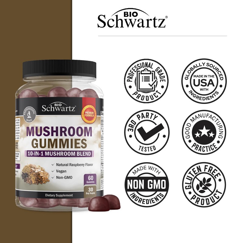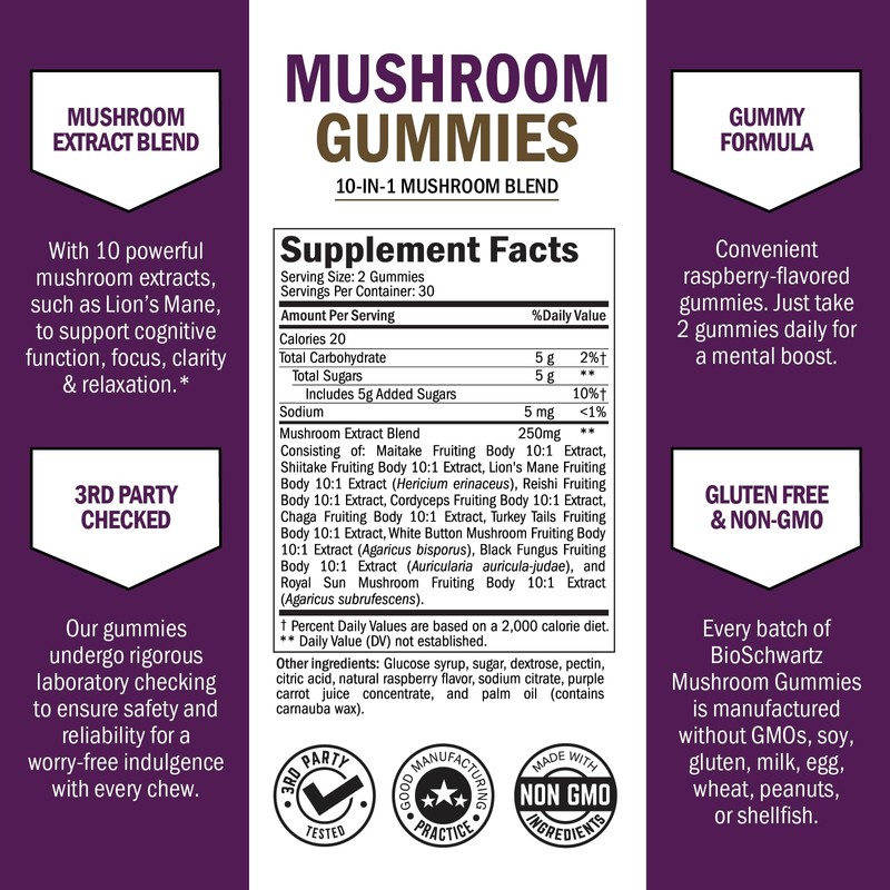 • 10-in-1 Mushroom Gummies - Packed with 10 functional mushrooms, these mushroom gummies for adults provide a wide array of benefits in convenient and tasty wild raspberry flavored gummy form