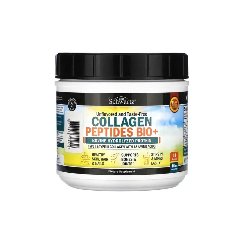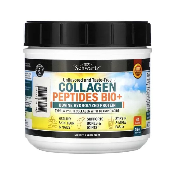 BioSchwartz Péptidos De Colágeno Bio + 454 G Sabor Sin Sabor' es un suplemento alimentario de calidad profesional, sin sabor y de origen bovino. Contiene colágeno tipo I y tipo III con 18 aminoácidos que contribuyen a la salud de la piel, el cabello y las uñas, y refuerzan los huesos y las articulaciones. Este producto se agita y se mezcla fácilmente.