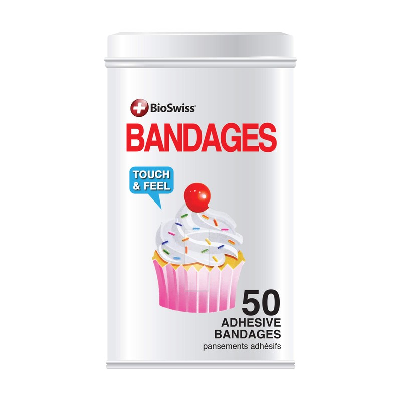 BioSwiss Novelty Bandages Collectable Tin, Self-Adhesive Funny First Aid Bandages, Novelty Gag Gift 50 Pieces (Cupcake)