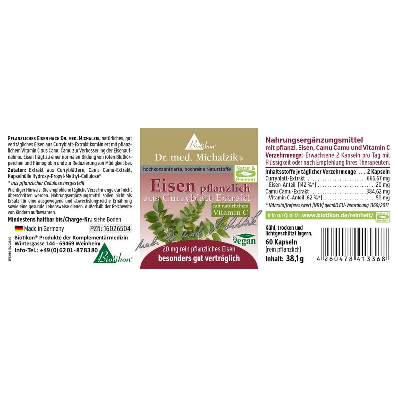 ProduktbeschreibungenEisen pflanzlich aus Curryblattextrakt nach Dr. med. Michalzik unterliegt der strengen Prfung deutscher Kontrollbeh?rden. Wir sind als deutsches Lebensmittelunternehmen bei der ?rtlichen, zust?ndigen Lebensmittelberwachung registriert und werden im Rahmen der staatlichen Lebensmittelkontrollen entsprechend berwacht.Viele Nahrungserg?nzungsmittel-Anbieter verwenden zur Versiegelung der Dosen Aluminium. Bei dieser sog. Induktions-Versielgelung wird eine Aluminiumfolie durch ein hochfrequentes elektromagnetisches Feld sehr stark erhitzt. Dieses Verfahren verwenden wir bewusst nicht!Eisen pflanzlich aus Curryblattextrakt nach Dr. med. Michalzik. Ein echtes Geschenk aus der Natur - nicht nur fr Veganer und Vegetarier. Die Tagesdosierung von 2 Kapseln enth?lt 20 mg natrliches Eisen. Dieses wird erg?nzt durch pflanzliches Vitamin C aus der Camu Camu-Pflanze fr eine optimale Eisenabsorption. Eisen aus Curryblattextrakt ist pflanzlich gebunden und deshalb besonders gut vertr?glich. Synthetische Eisenpr?parate k?nnen unangenehme Nebenwirkungen, vor allem Magen-/Darmbeschwerden wie Durchfall, belkeit oder Verstopfung verursachen.Eisen tr?gt bei: zu einer normalen Bildung von roten Blutk?rperchen und H?moglobin, zur Reduzierung von Mgigkeit, zu einer normalen Denkleistung bei Erwachsenen, zu einer normalen Entwicklung der Denkf?higkeit bei Kindern, zum Erhalt eines normalen Immunsystem.Packungsinhalt: 60 Kapseln, jede Kapsel enth?lt 10 mg Eisen und 25 mg Vitamin C.Tagesdosierung: 2 Kapseln mit Flssigkeit oder nach Empfehlung Ihres Therapeuten.Inhaltsstoffe je Tagesdosierung: Curryblatt-Extrakt 666,67 mg, Eisen-Anteil (142 %*) 20 mg, Camu Camu-Extrakt 384,62 mg, Vitamin C-Anteil (62 %*) 50 mg* Referenzwert gem?? NRVPreisinfo je 100 Gramm: 65,49 EuroFr Veganer/Vegetarier geeignet!Inhaltsstoffe / ZutatenExtrakt aus Currybl?ttern, Camu Camu-Extrakt, Kapselmaterial Hydroxy-Propyl-Methyl-Cellulose (aus pflanzlicher Cellulose hergestellt). Glutenfrei, Lactosefrei, Gelatinefrei. Verpackung aus PET, daher ohne Weichmacher. Info zur Rckstandskontrolle: Bitte kontaktieren Sie uns. Reinsubstanzen ohne Zusatz- und Fllstoffe in der Kapselfllung. Wir liefern frische Ware.GebrauchsanweisungTagesdosierung: 2 Kapseln mit Flssigkeit oder nach Empfehlung Ihres Therapeuten.WarnhinweiseWichtige Hinweise: Die empfohlene t?gliche Verzehrmenge darf nicht berschritten werden. Nahrungserg?nzungsmittel sollen nicht als Ersatz fr eine ausgewogene und abwechslungsreiche Ern?hrung sowie eine gesunde Lebensweise dienen. Einnahme bei Kindern, Schwangeren und Stillenden nur nach Rcksprache mit einem Arzt. Au?erhalb der Reichweite von Kindern aufbewahren.