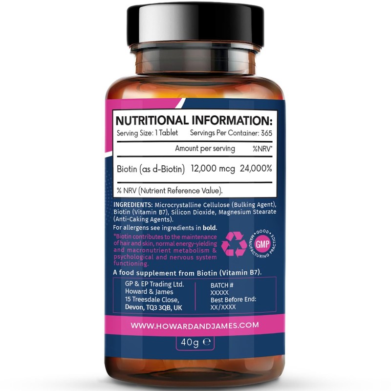 - ✔ HIGH STRENGTH BIOTIN 12,000 mcg VEGAN TABLETS x365 (12 MONTHS SUPPLY) | Howard & James Biotin 12000mcg offers you 365 day’s supply of essential nourishment of Vitamin B7 Biotin for Hair, Skin and Energy-Yielding Metabolism.