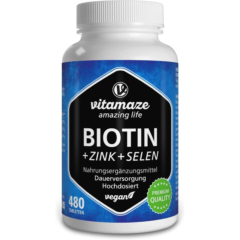 - High dose: 480 small, vegan tablets for 480 days for continuous use with 10,000 mcg biotin supplemented with zinc and selenium, the ideal combination for skin, hair growth and nails.