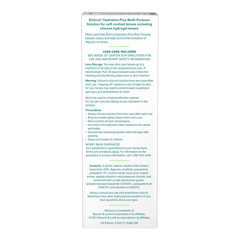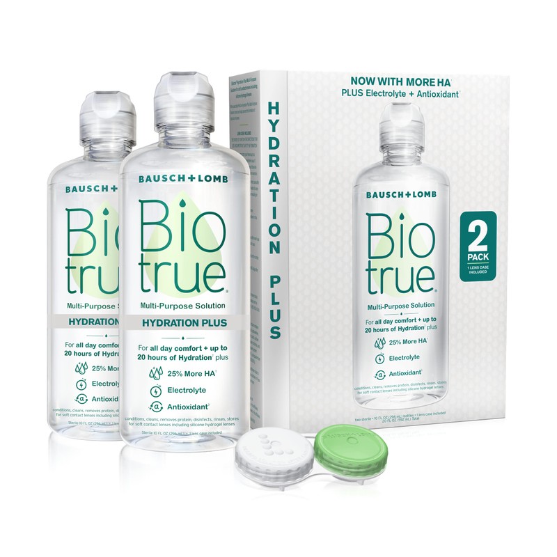 - MULTI-PURPOSE SOLUTION: Biotrue Hydration Plus contact lens solution can be used to store, clean, and disinfect contacts in a lens case when not being worn, or to rinse contacts before wear. Available in 4 fl oz bottles, 10 fl oz bottles, and packs of two 10 fl oz bottles. For soft contact lenses including silicone hydrogel lenses. BIO.0005.USA.22